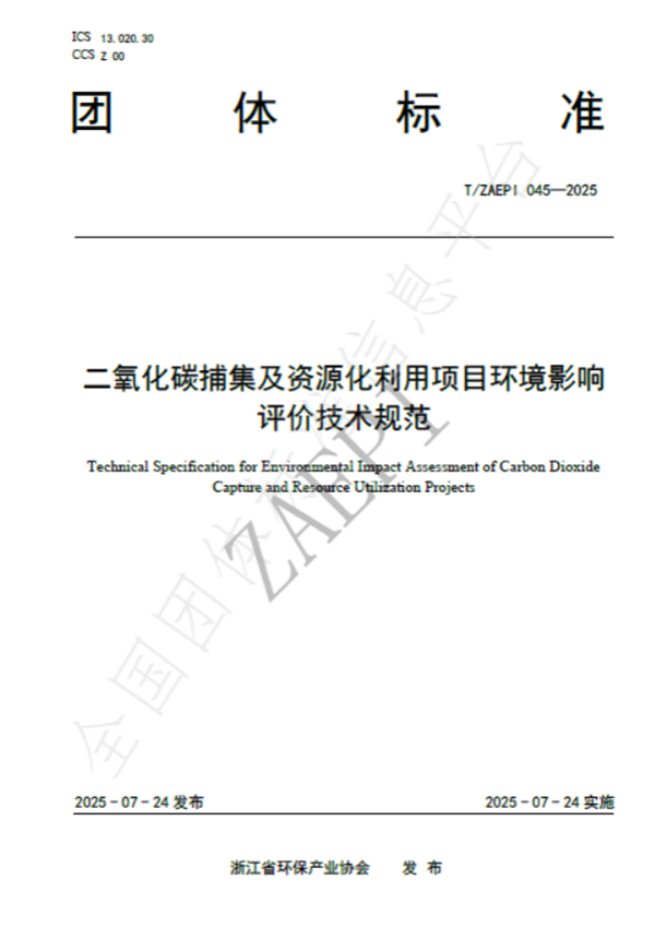 2025年7月24日,由今年会环保集团生态环保研究院牵头制定的《二氧化碳捕集及资源化利用项目环境影响评价技术规范》(T/ZAEPI 045-2025)团体标准正式发布并实施。该标准由浙江省环保产业协会归口管理,联合省内多家环保领域骨干企业共同起草,填补了工业领域二氧化碳捕集及资源化利用项目环评技术规范的空白。