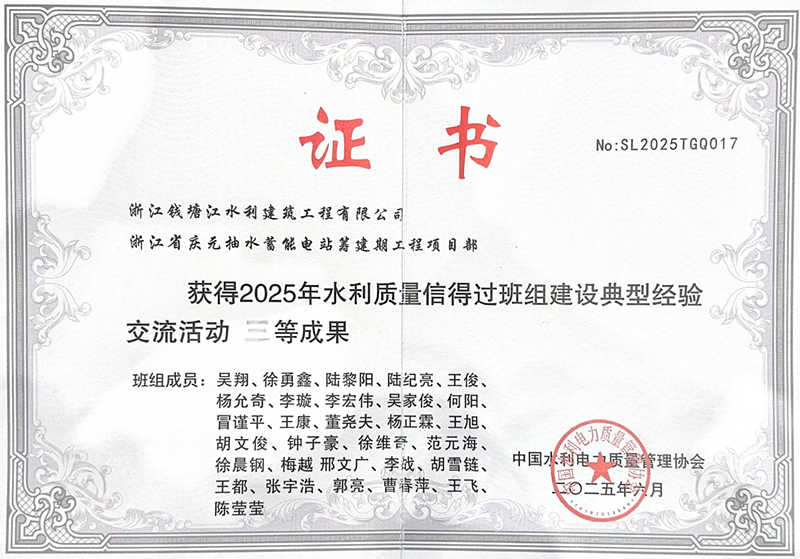 近日,中国水利电力质量管理协会公布2025年度水利质量信得过班组建设典型经验交流活动评选结果,庆元抽蓄筹建期EPC总承包项目凭借扎实有效的质量管理实践和突出的建设成果,荣获“2025年水利质量信得过班组建设典型经验交流活动”三等成果。这一荣誉不仅为“浙钱水建”品牌再添光彩,更标志着公司在工程质量管理领域获得了行业权威机构的高度认可。